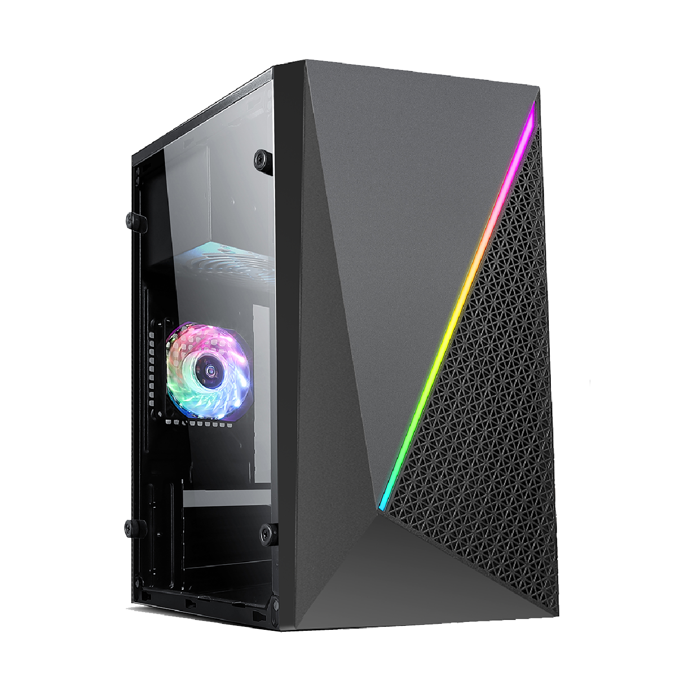 The GC165-18 cabinet is a sleek and modern MicroATX/Mini ITX chassis designed for users who want performance with style. Its geometric front panel features an integrated RGB lighting strip, giving it a futuristic and premium look. Despite its compact dimensions, it accommodates GPUs up to 255mm and CPU coolers up to 145mm, making it suitable for versatile builds ranging from home PCs to gaming setups. The case supports multiple storage options, with space for both HDDs and SSDs, ensuring flexibility for different user requirements. Cooling is efficient, with a rear-mounted 120mm fan and optional mounts for additional front intake fans. Front panel I/O includes USB 2.0 ports and audio/mic jacks for everyday convenience. Built from high-quality SPCC steel, the GC165-18 offers durability with a lightweight frame, ensuring long-term reliability. Stylish, functional, and efficient, this cabinet is ideal for gamers, students, and professionals looking for a balance between aesthetics and practicality in their desktop systems.