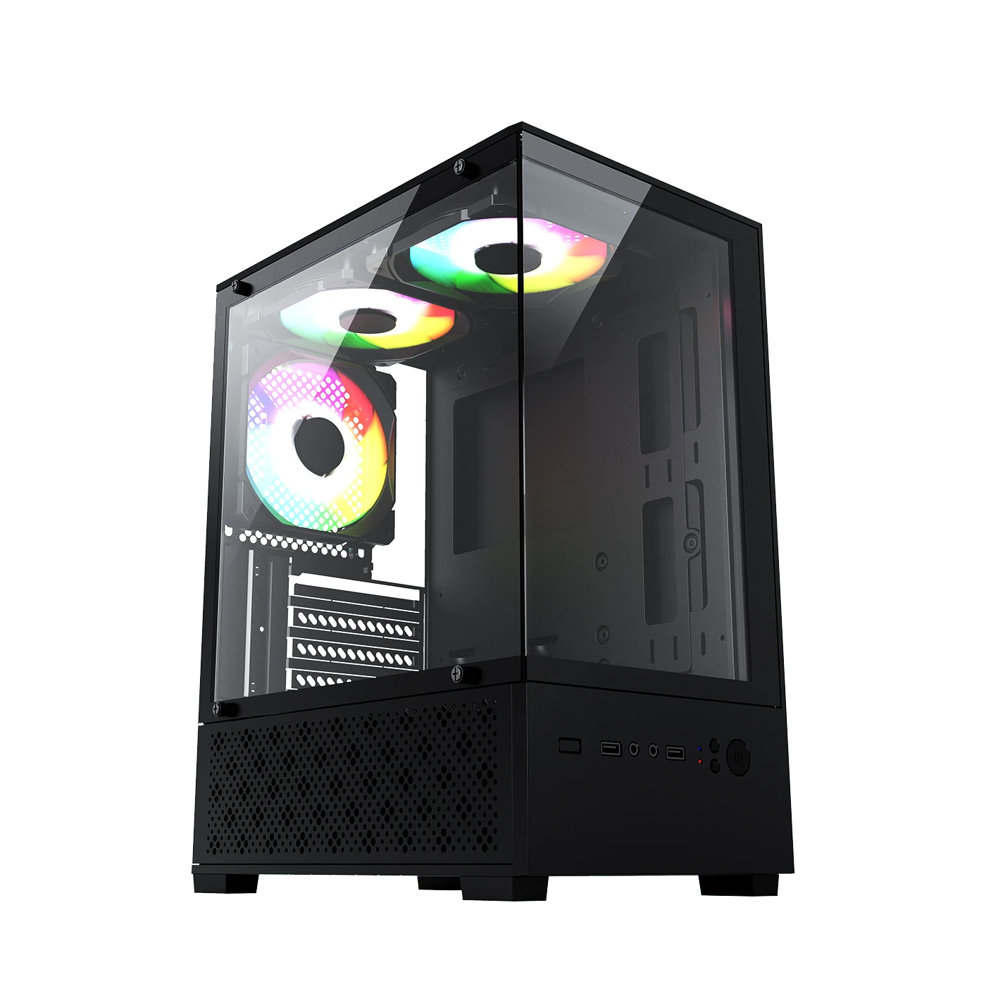 The GCT8 Gaming PC Cabinet is a compact and efficient chassis engineered specifically for Micro-ATX builds, offering a perfect balance of size, performance, and modern aesthetics. Designed for gamers and builders who prefer a smaller footprint without sacrificing essential features, this case is built with a focus on quality and thermal management. Its standout visual feature is the elegant 3mm thick glass side panel, which provides a clear view of your components, allowing you to showcase your build in style.