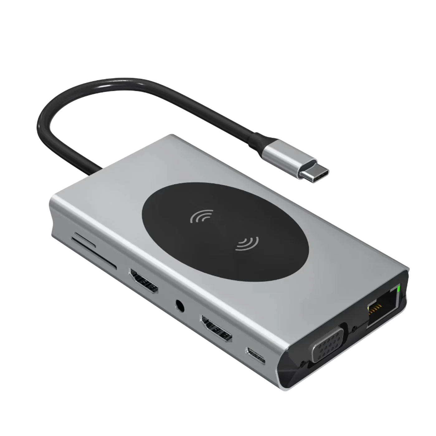 The GL-53 14-in-1 Type C Multiport Adapter is a powerhouse of connectivity engineered for advanced users who demand it all. Featuring 14 essential ports, this adapter goes beyond traditional docking by including wireless charging support along with dual HDTV outputs for extended dual-display setups at 4K30Hz. Crafted from premium aluminum alloy, the GL-53 ensures strength, durability, and efficient heat dissipation. It comes equipped with multiple USB 3.0 and USB 2.0 ports for keyboards, drives, and accessories, plus SD/TF card slots for fast data transfer. The 100W Power Delivery support means uninterrupted charging for high-performance laptops, while the RJ45 Ethernet port guarantees reliable wired internet. Built-in VGA and audio ports enhance versatility for both modern and legacy devices. What makes the GL-53 stand out is its wireless charging capability, making it ideal for users who want a true all-in-one solution for desk setups. Compatible across Windows, macOS, Linux, and Android, it is plug-and-play ready for both work and entertainment. From presentations to creative workflows, this dock transforms any workstation into a command center of productivity.